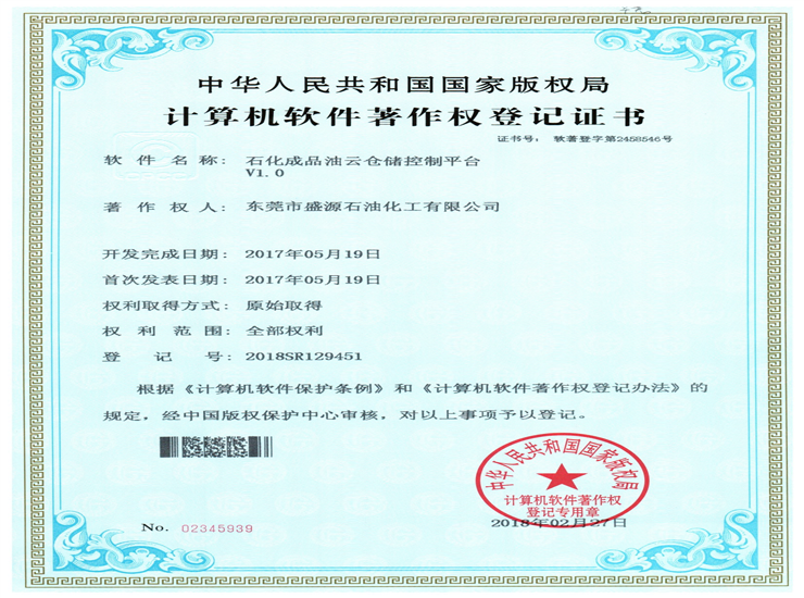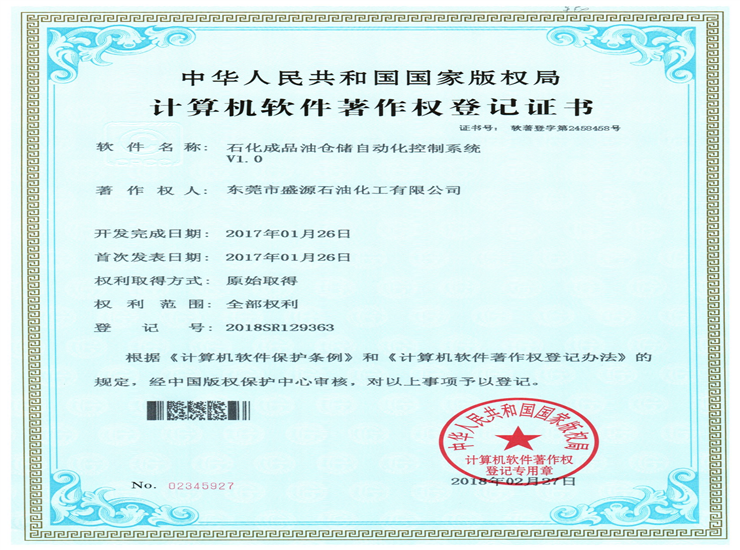 • 石化成品油分類存儲(chǔ)系統(tǒng)著作權(quán)登記證書Click for larger image