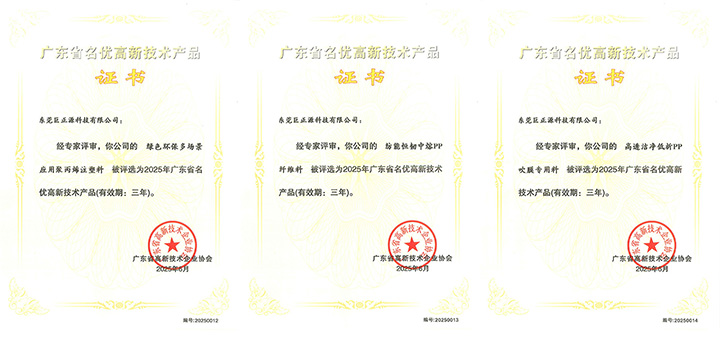近日,廣東省高新技術企業協會公布了2025年第一批廣東省名優高新技術產品名單。東莞巨正源科技有限公司的“綠色環保多場景應用聚丙烯注塑料”、“紡能恒韌中熔PP纖維料”、“高透潔凈低析PP吹膜專用料”三項產品憑借卓越的產品品質、創新的產品技術和領先的市場地位,榮獲“廣東省名優高新技術產品”稱號。