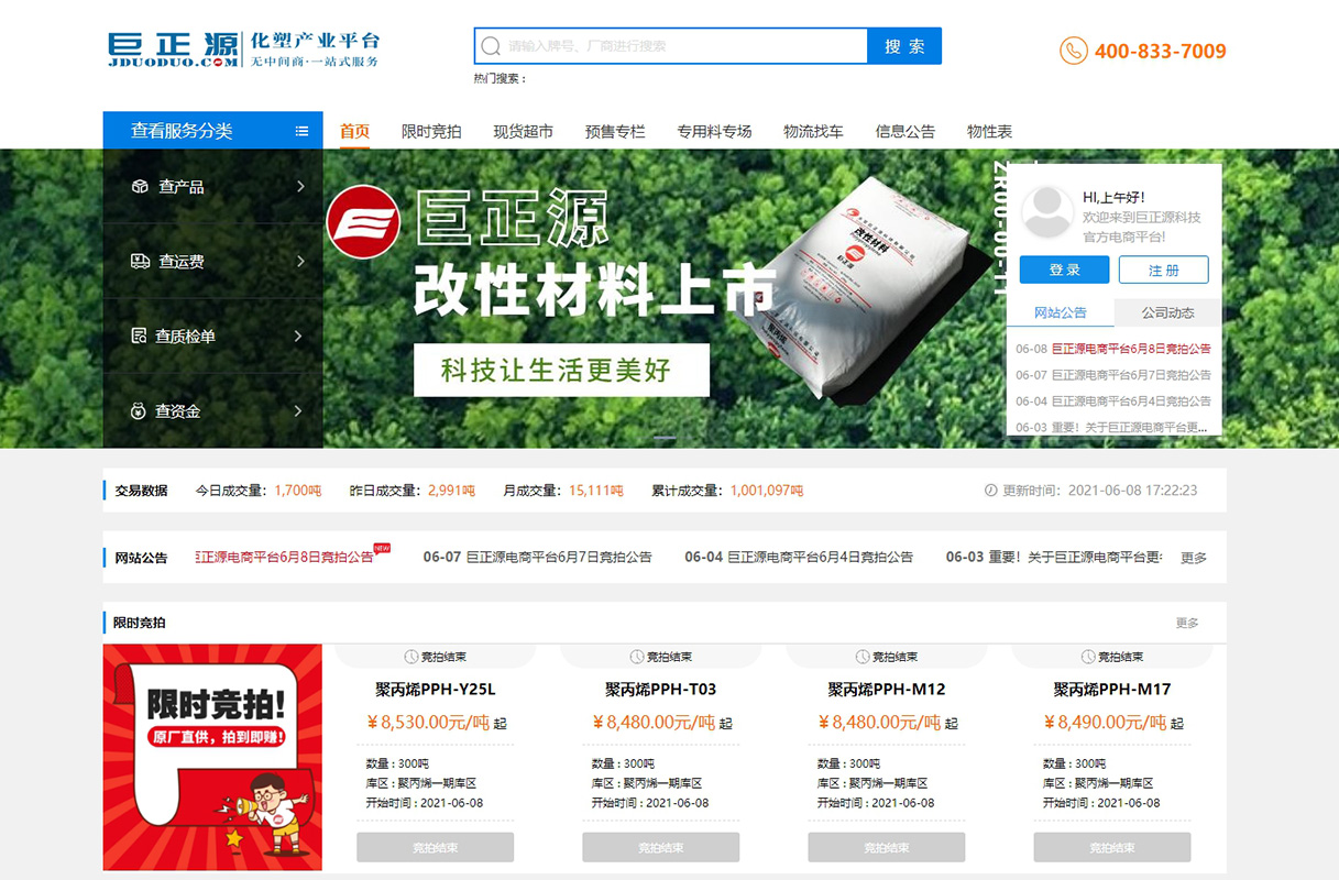 截至2021年6月8日,“巨正源電商平臺”聚丙烯線上交易總量累計達到100.11萬噸,突破百萬噸大關!