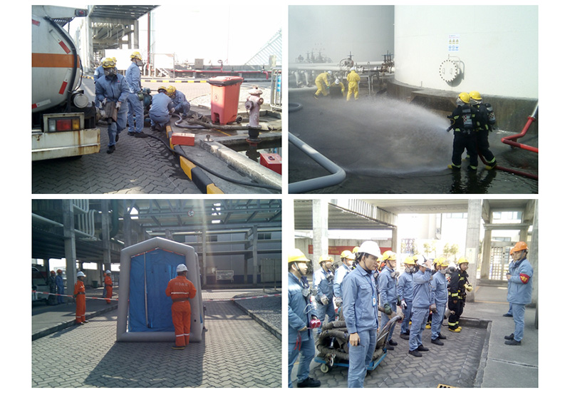 1月23日,盛源公司聯合立沙島應急基地在罐區舉行了T610罐金屬軟管破裂“盲演”(不預先通知時間、地點,不設臺詞劇本)。現場作業人員發現T610罐金屬軟管發生破裂泄漏后迅速報告,總指揮迅速啟動公司生產事故二級響應,現場指揮組織各應急小組集合趕赴現場開展堵漏搶險工作。搶險救援組對泄漏點進行堵漏,但并未堵漏成功,隨后聯系立沙島應急基地請求外部支援。立沙島應急基地人員到達現場后,與公司各應急小組人員緊密配合,最終堵漏成功。