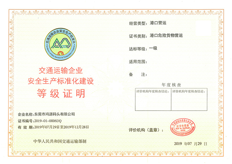 巨正源所屬盛源石化、鴻源碼頭榮獲安全生產(chǎn)標(biāo)準(zhǔn)化建設(shè)一級達(dá)標(biāo)證書