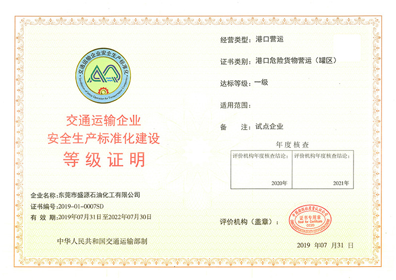 日前,巨正源所屬盛源石化、鴻源碼頭正式獲得由國家交通運(yùn)輸部頒發(fā)的“交通運(yùn)輸企業(yè)安全生產(chǎn)標(biāo)準(zhǔn)化建設(shè)一級達(dá)標(biāo)企業(yè)證書”,這標(biāo)志著盛源石化、鴻源碼頭安全生產(chǎn)管理邁上標(biāo)準(zhǔn)化、規(guī)范化的新臺階。