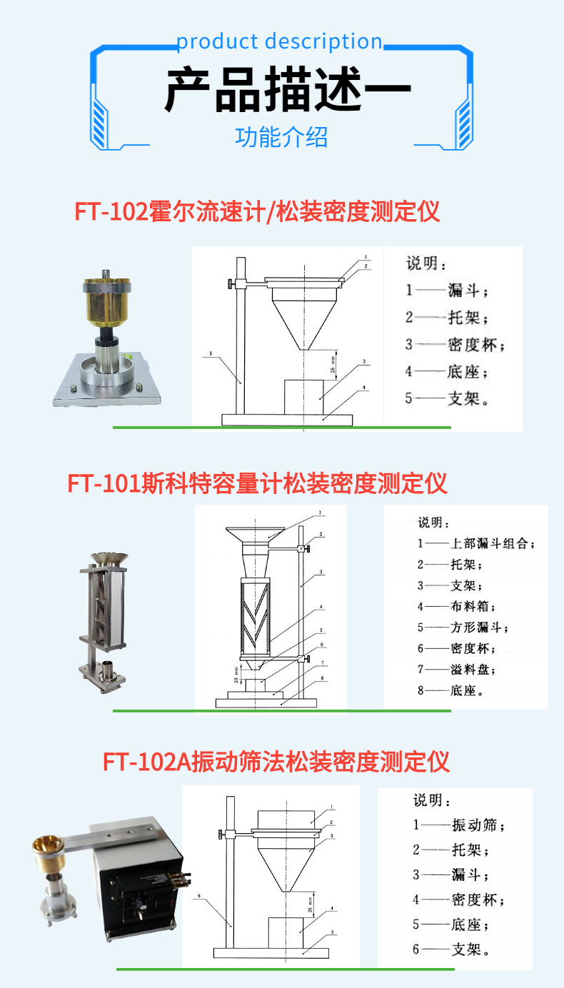 松裝密度測定儀適用于不能自由流過漏斗法中孔徑為5mm的漏斗和用振動漏斗法易改變特性粉末。其測試原理為金屬粉末的流動性,以50g金屬粉末流過規定孔徑的標準漏斗所需要的時間來表示。粉末漏斗孔徑按一定高度自由落下充滿杯子。在松裝狀態下,以單位體積粉末的質量表示粉末的松裝密度。