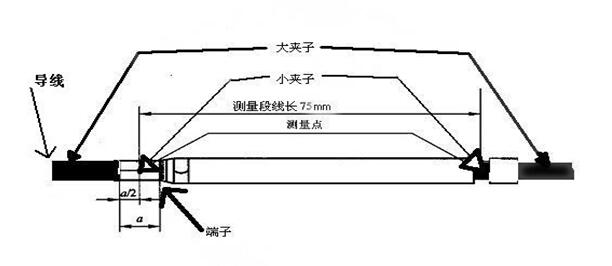 如上示兩圖中,圖1導(dǎo)線首端帶有端子,測(cè)量75mm長(zhǎng)帶端子導(dǎo)線的兩端壓降,記錄數(shù)據(jù)備用;圖2中導(dǎo)線不帶端子,直接測(cè)量75mm長(zhǎng)導(dǎo)線的兩端壓降,記錄數(shù)據(jù);,用圖1中測(cè)得的壓降減去圖2中測(cè)得的壓降即為被測(cè)端子的壓降。