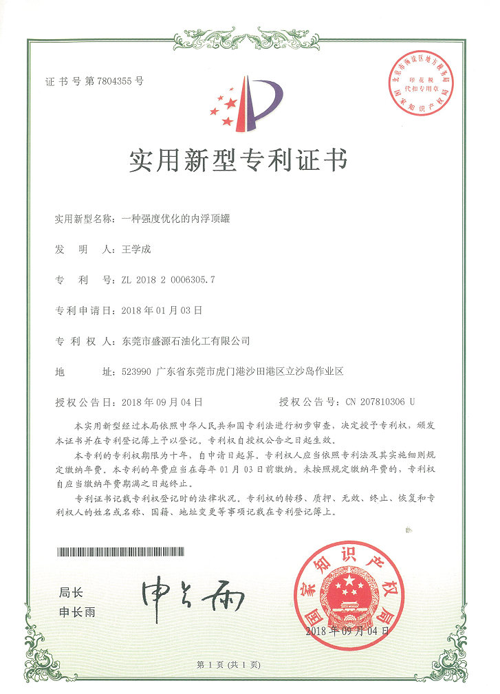 實用新型內浮儲罐專利證書