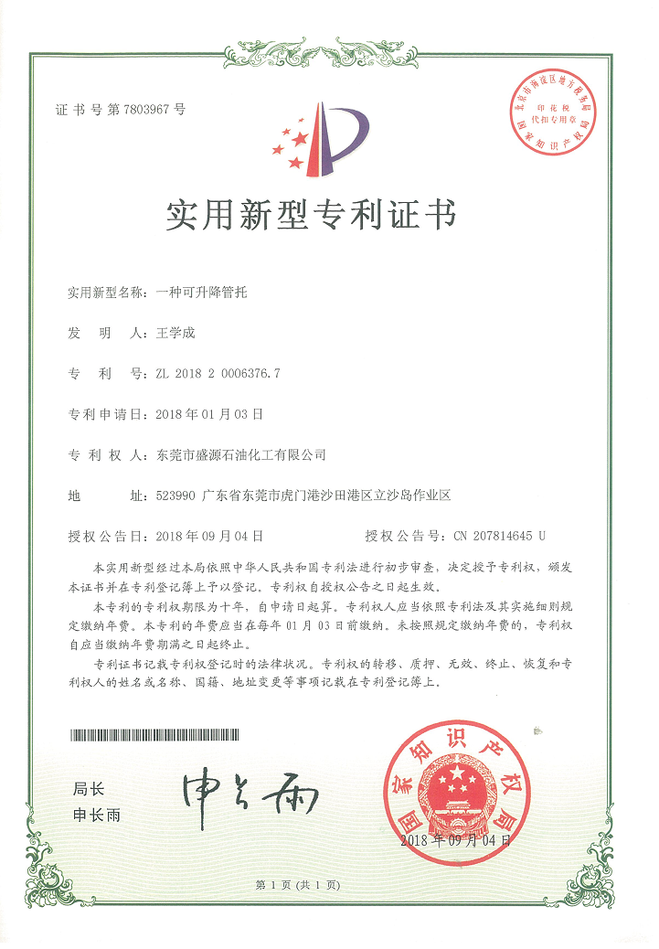 實用新型升降管托專利證書