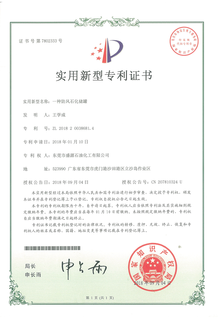 實用新型防風石化儲罐專利證書