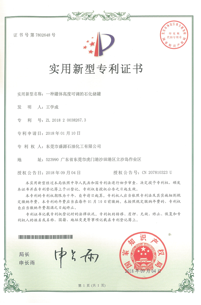 實(shí)用新型可調(diào)儲罐專利證書