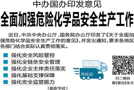 近日,中共中央辦公廳、國務院辦公廳印發(fā)了《關(guān)于全面加強危險化學品安全生產(chǎn)工作的意見》,并發(fā)出通知,要求各地區(qū)各部門結(jié)合實際認真貫徹落實。